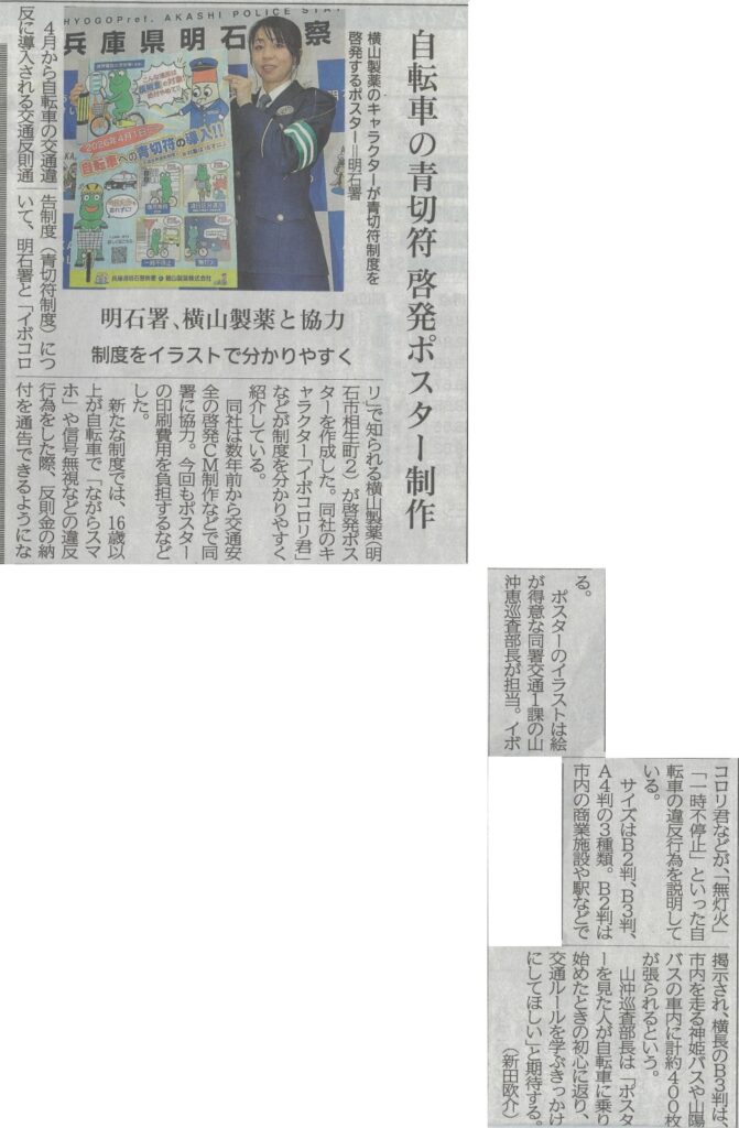 神戸新聞(2026年2月10日朝刊)に明石警察署様とのコラボに関する記事が掲載されました。 2026/02/12 最終更新日時 : 2026/02/12 editor 弊社と明石警察署様とのコラボによる交通安全・生活安全の啓発活動は2026年で5年目を迎えました。今年の4月よりスタートする「自転車の青切符制度」開始を周知する活動が神戸新聞に掲載されました。 一覧へ戻る